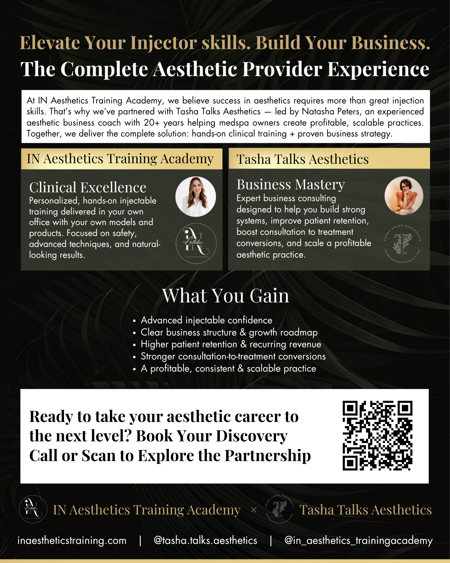 That’s why we’ve partnered with Tasha Talks Aesthetics to offer you the complete solution: expert hands-on injectable training combined with proven business strategy for building a profitable practice.